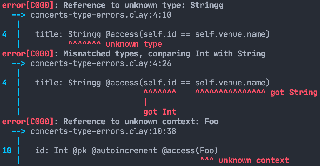 The Clay CLI is always ready to help with detailed diagnostics that point out what went wrong with the context needed to fix it.